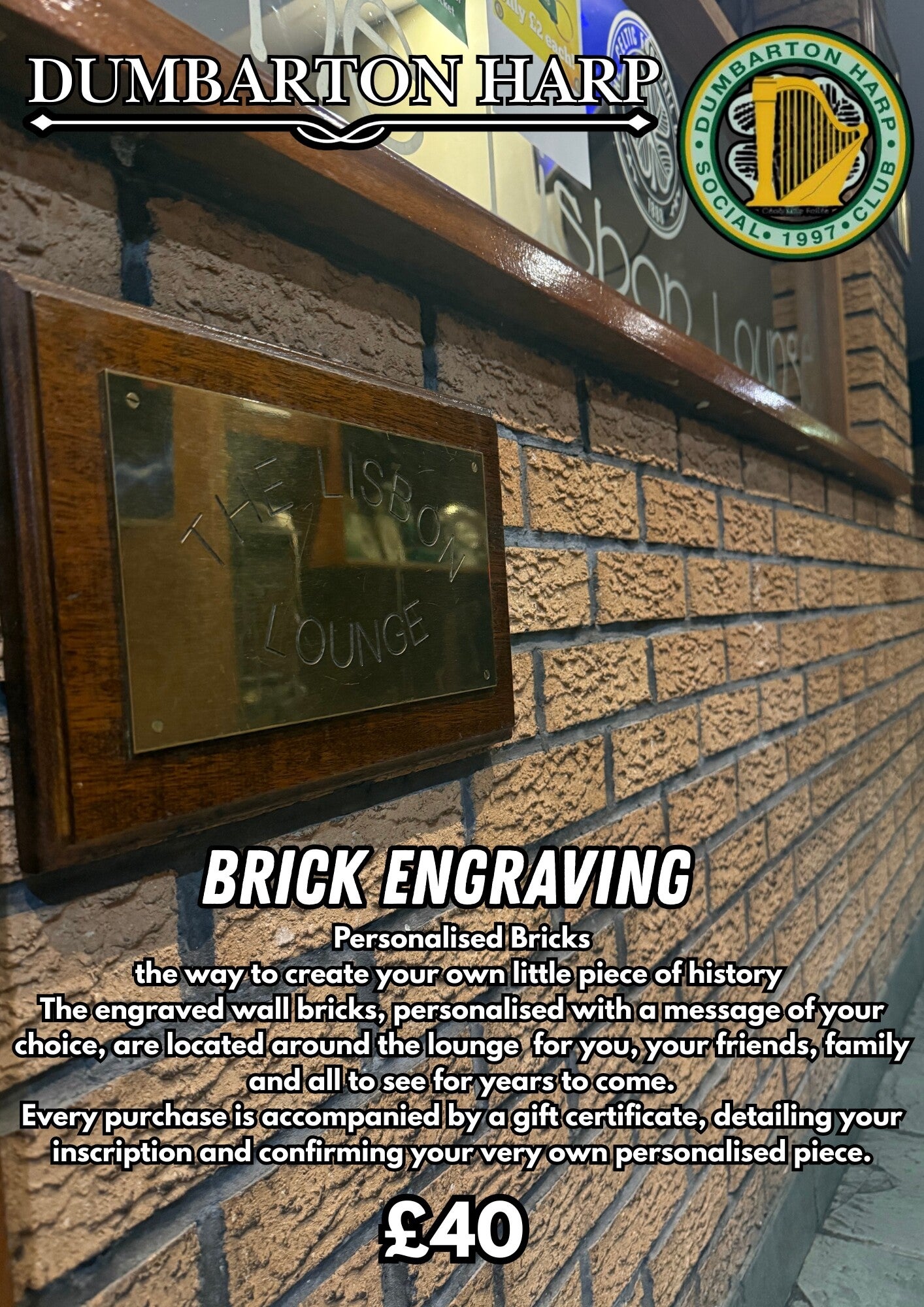 Your engraved brick will be proudly displayed on our wall, becoming a permanent fixture in the Dumbarton Harp Social Club. It's more than just a brick; it's a testament to your support and a piece of our shared journey. Each purchase helps us continue to grow and create a welcoming space for everyone.